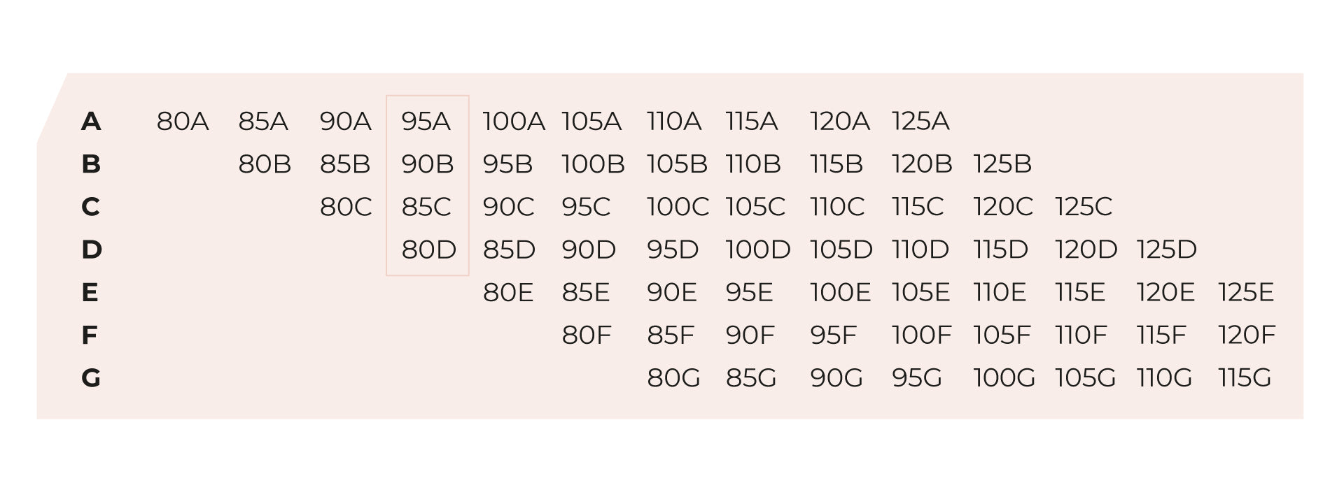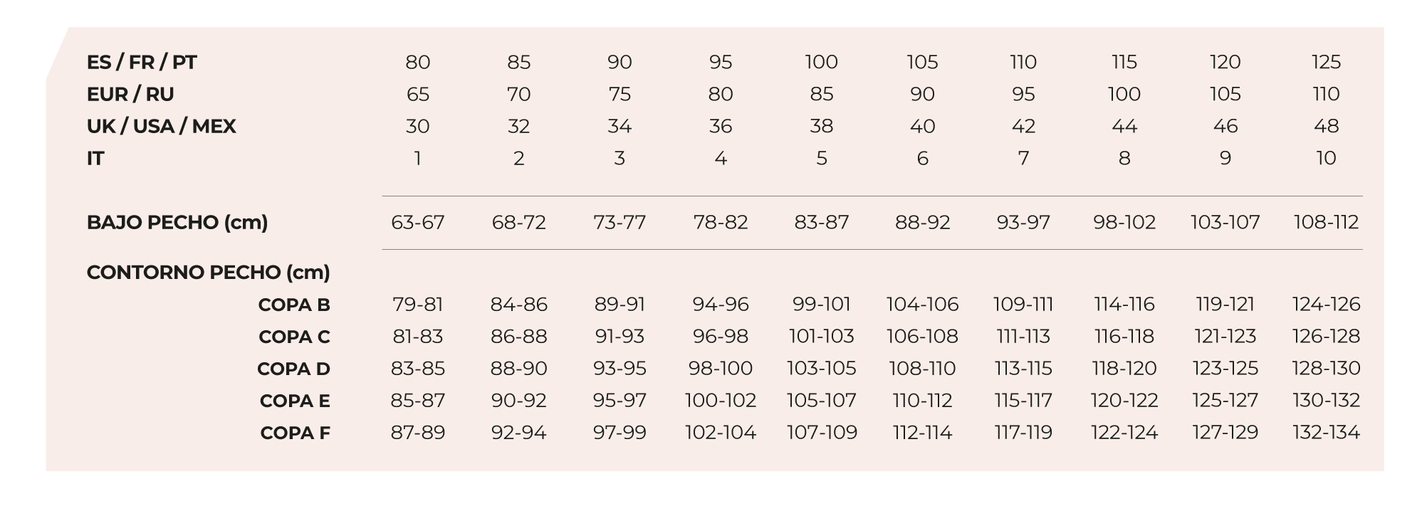 Existe una equivalencia de tallas según variación de copa y bajo pecho.