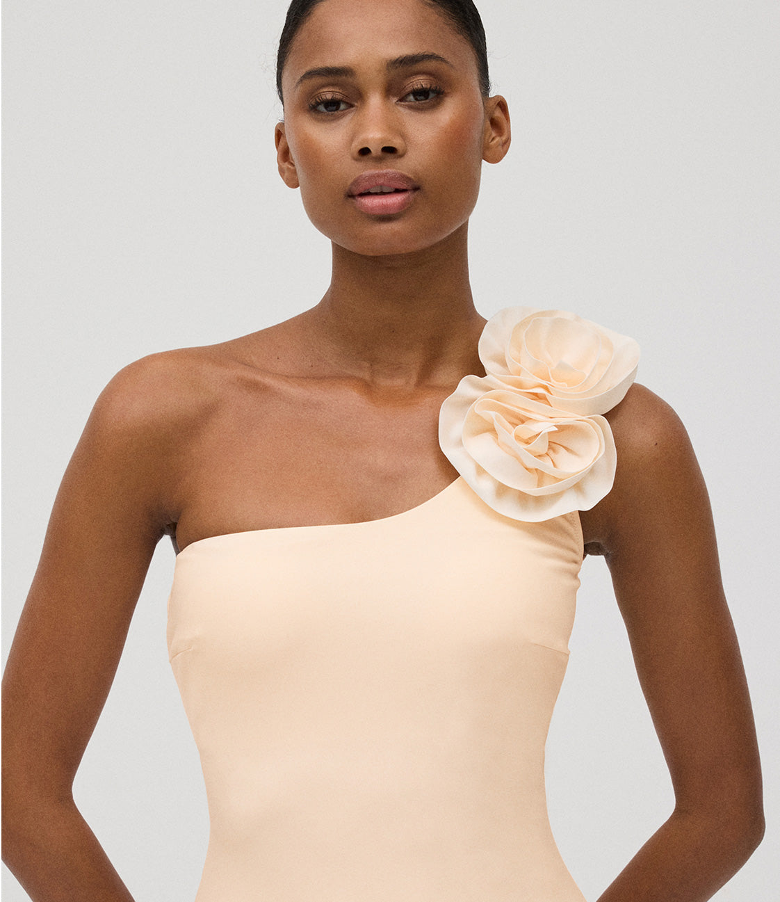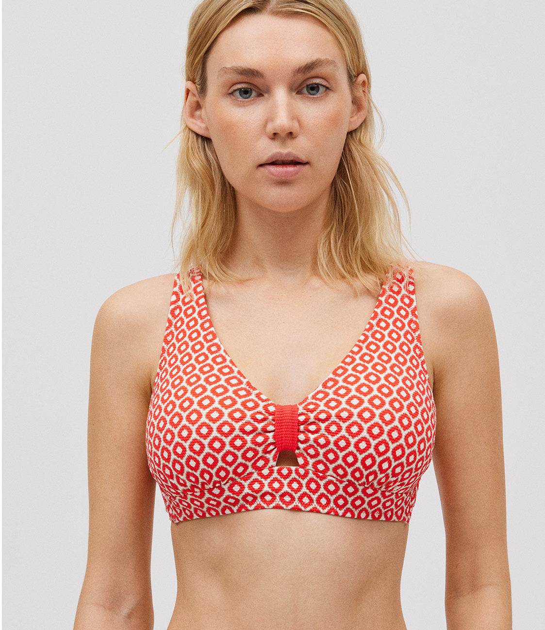 Ruffles, straps or bows on the sides to add volume and shape to the hips. Styles with large or bold prints on the bottom are also a good option.